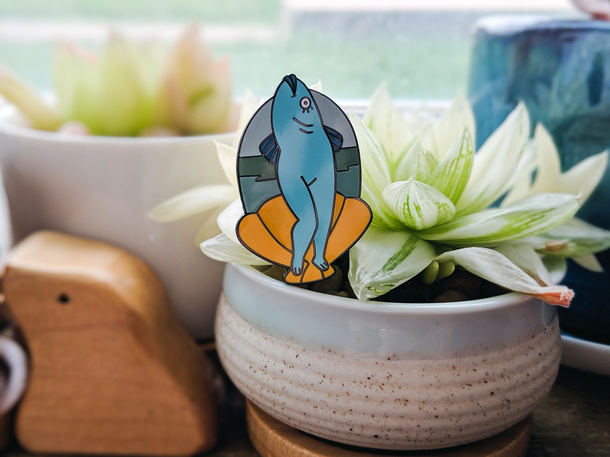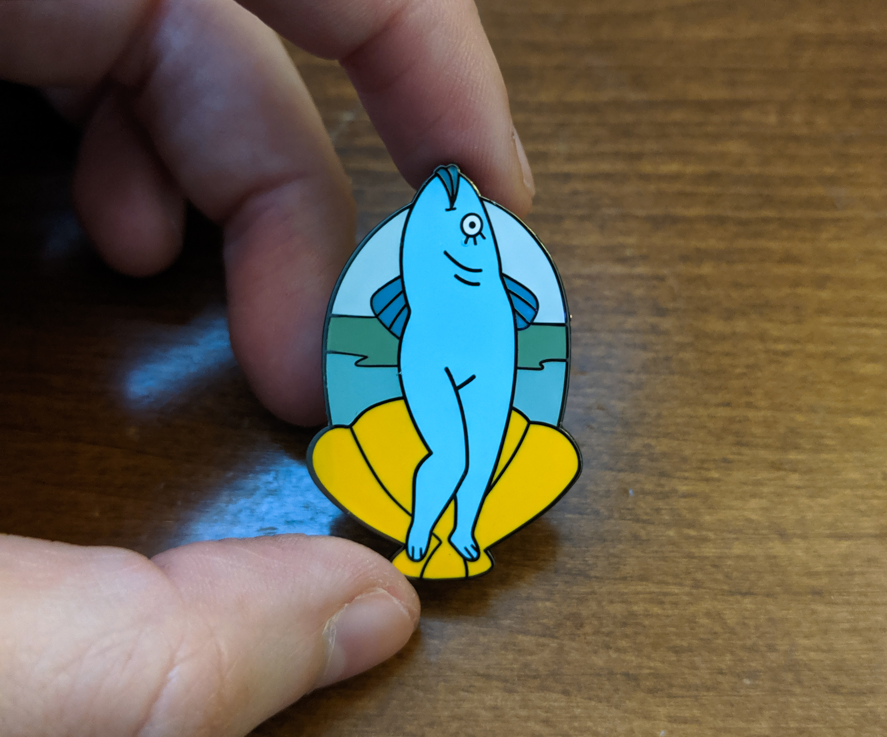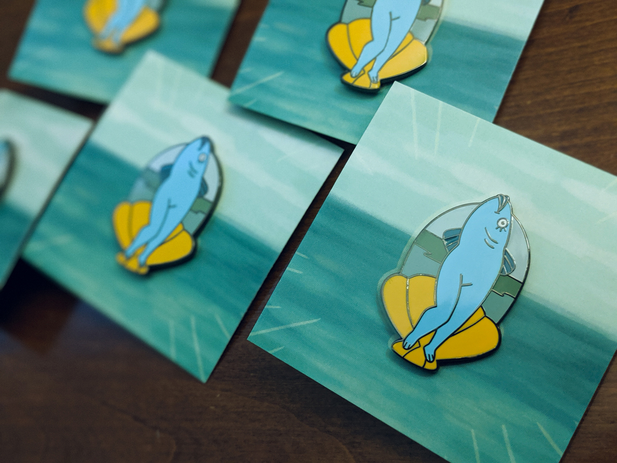 1.5" tall hard enamel pin, black nickel plating, two pinbacks
